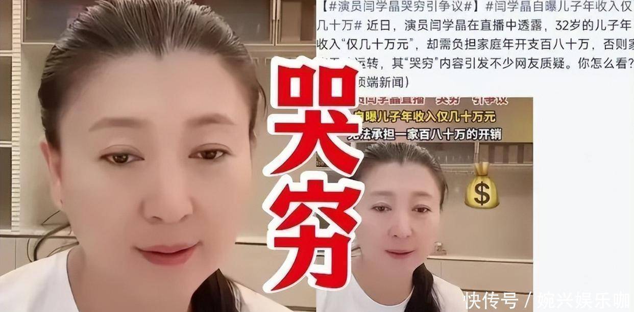 即便53岁的闫学晶现在并不那么红,但是她曾经饰演的“国民媳妇”之类的角色形象早已深入人心,早已在艺术之路上打下了坚实的经济基础。如今就算儿子一年赚几十万,也足以让正常的家庭过上相对富足的日子。如果说,闫学晶的全家开销就要百八十万的话,那么减少开销完全可以解决生存问题。
