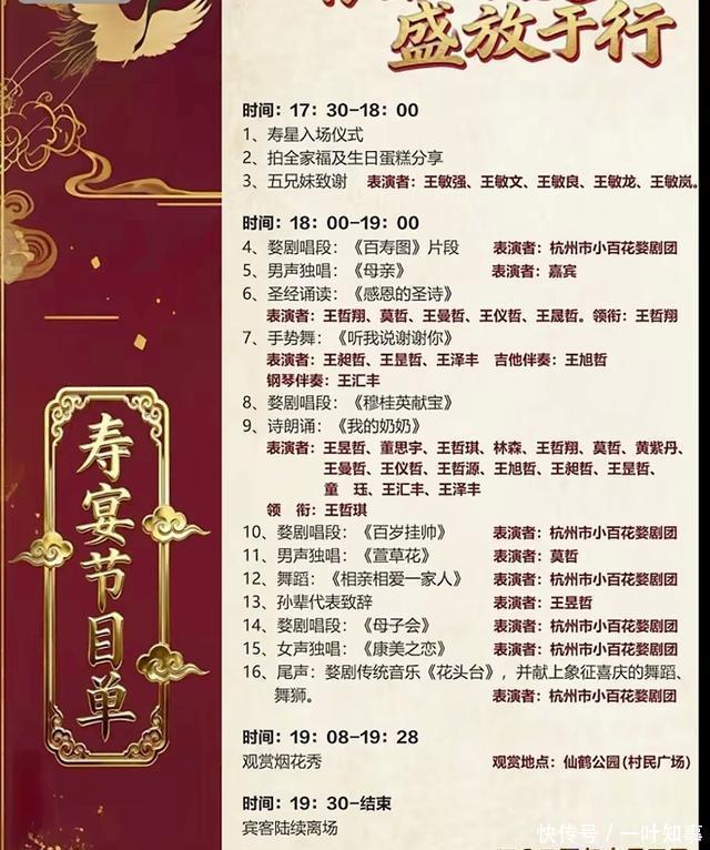 从寿宴节目单能看到,不仅有杭州小百花婺剧团的各种表演,还有专业的歌词表演,重头戏是孙辈们的各种感恩表演。
