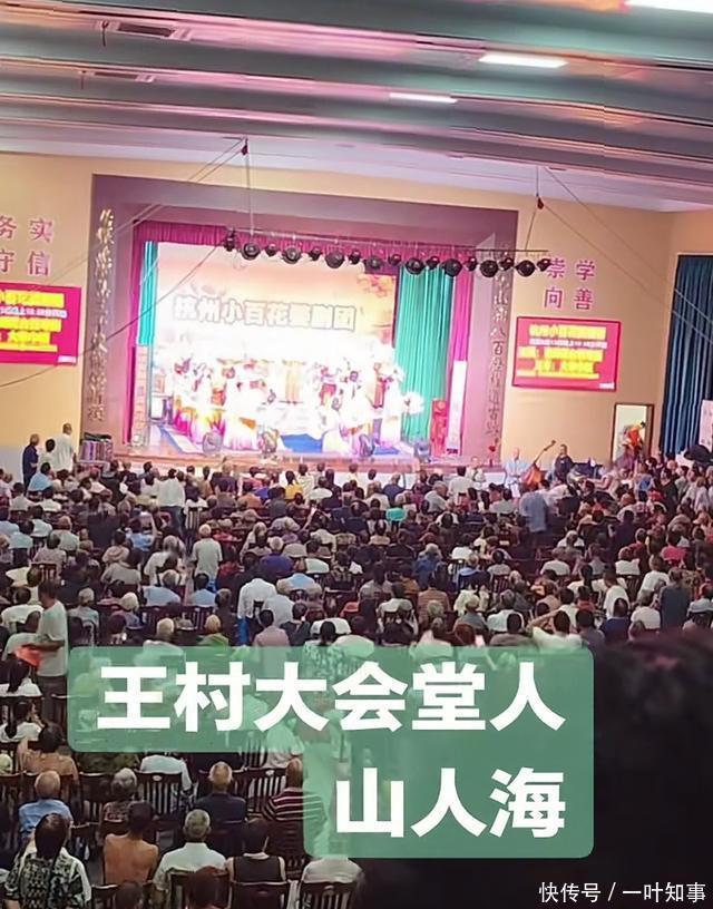 只见王村会堂人山人海的,挤满了人,看台上也很热闹。 仔细看能发现杭州小百花婺剧团在台上表演,等戏唱完,立马就有人开始收拾凳子,放上大圆桌。